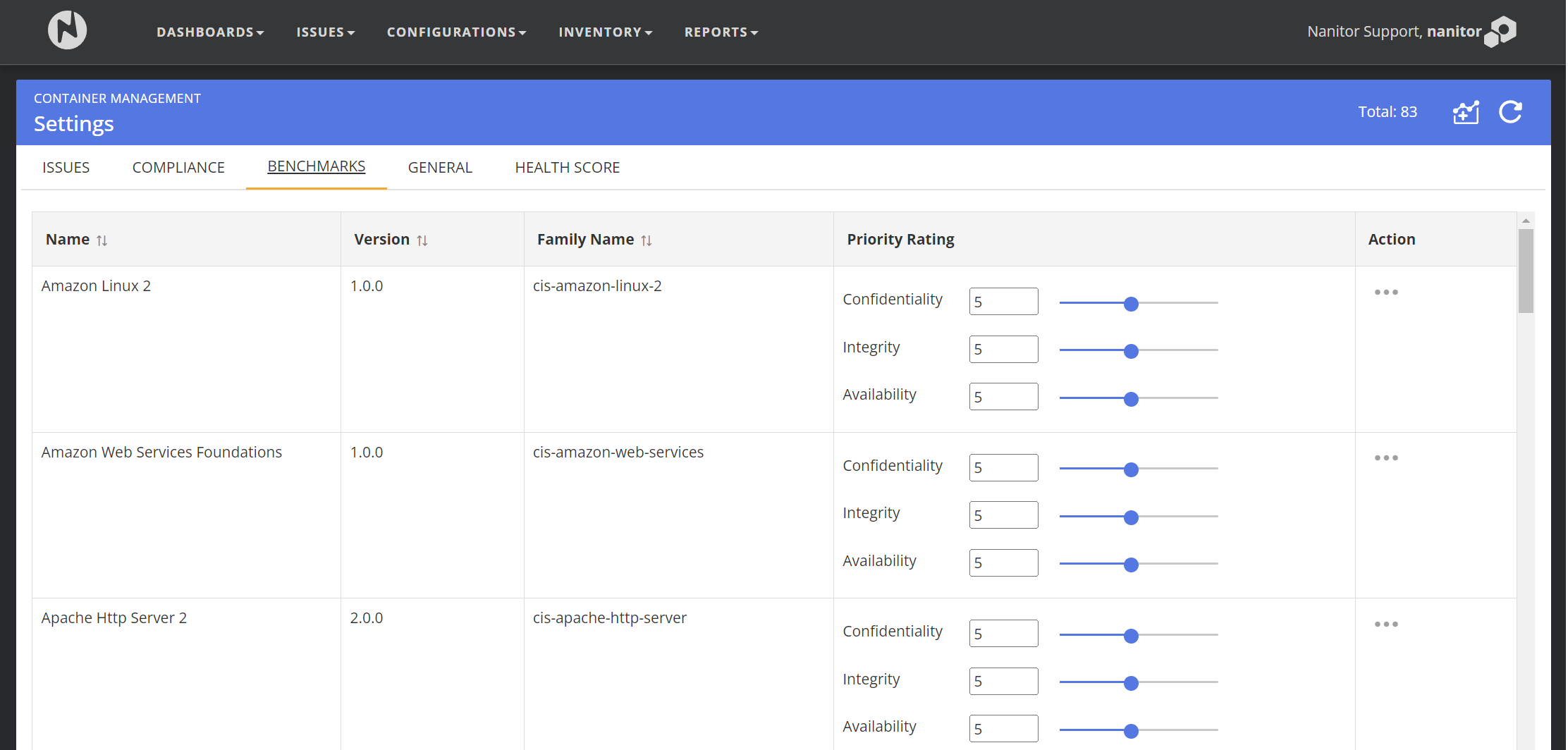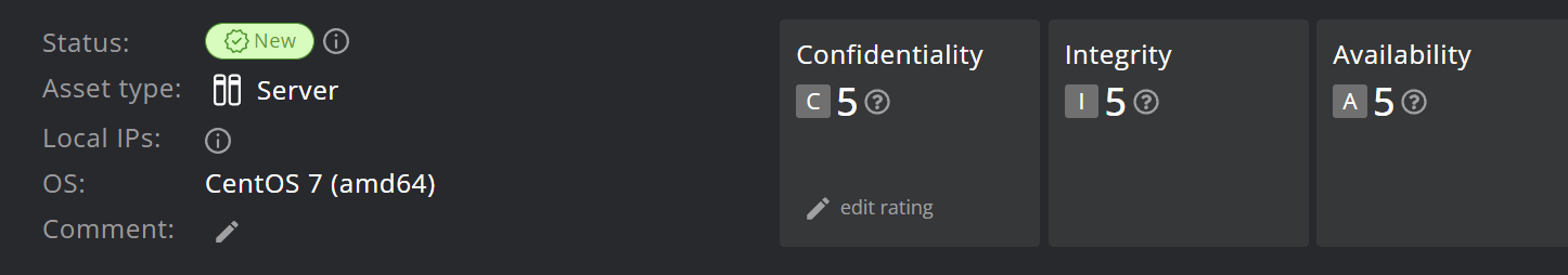 By default, each asset’s priority rating is set based on its assigned benchmark. On a clean install, every benchmark will assign a 5/5/5 (Confidentiality/Integrity/Availability) priority rating, but this should be changed for each benchmark under Organization Management → Settings → Benchmarks, to match the organization’s security requirements.
