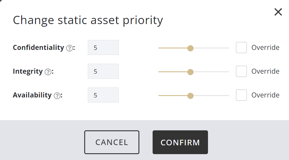 By default, each asset’s priority rating is set based on its assigned benchmark. On a clean install, every benchmark will assign a 5/5/5 (Confidentiality/Integrity/Availability) priority rating, but this should be changed for each benchmark under Organization Management → Settings → Benchmarks, to match the organization’s security requirements.