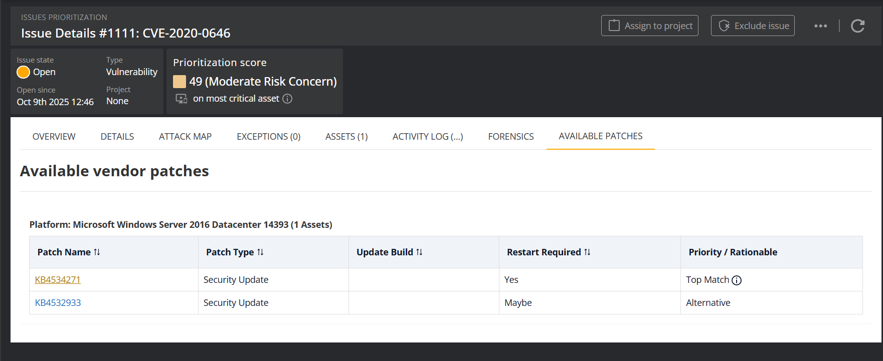 When viewing a vulnerability issue, the Available Patches tab shows which vendor patches address the vulnerability.