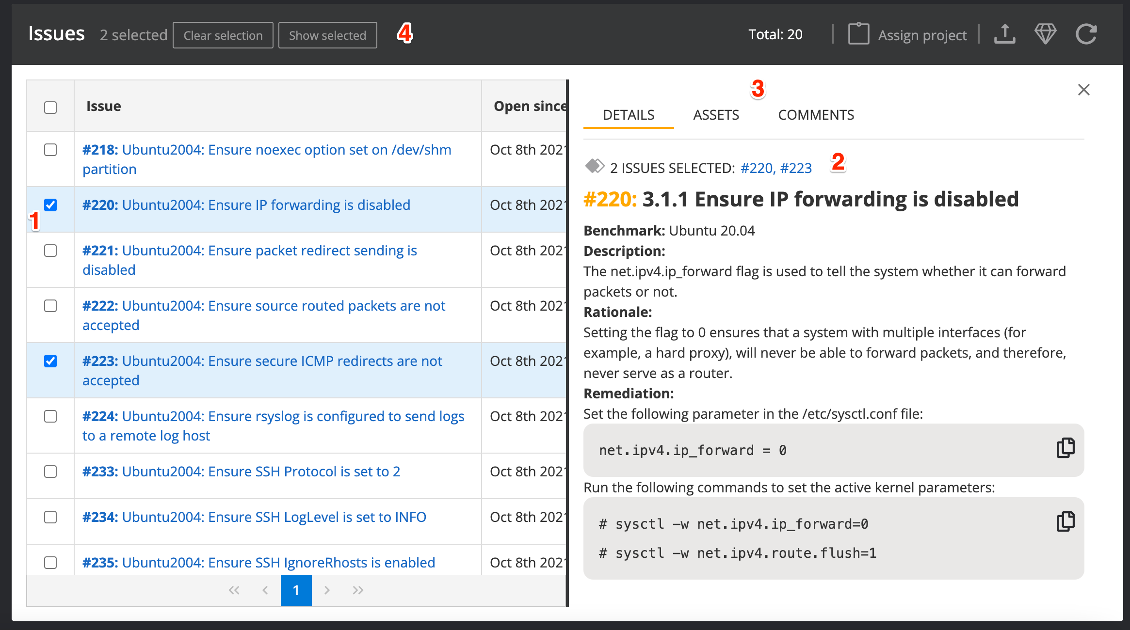 This will reveal the preview of the selected issues (2) without leaving the main issue page. When you have selected more than one issue you can scroll down the issue detail preview section to see the details. The issue preview will show all related information on the issues itself , the effected assets and any related comments to the selected issues.