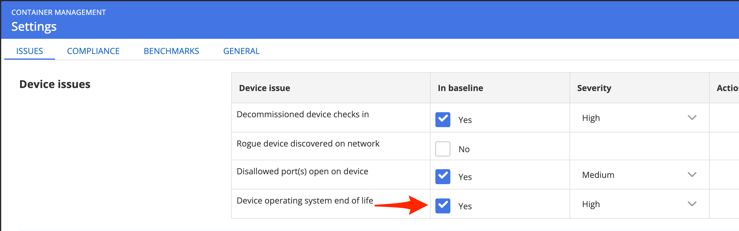 Nanitor administrators can enable the EOL feature by going to Organization Management -> Settings. In the Issues tab go to Device Issues and check the "Device operating system end of life" setting. The selected severity will define the issue priority for a detected EOL device issue