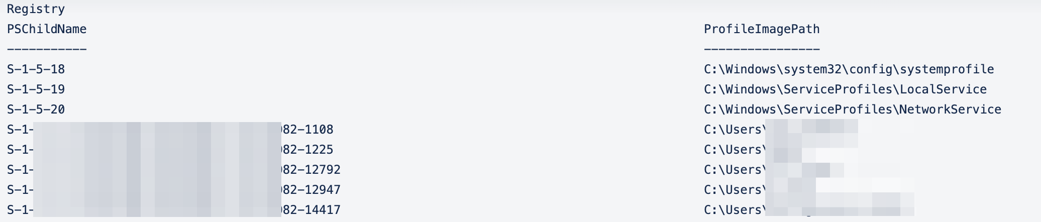 $profiles = Get-ItemProperty -Path 'Registry::HKEY_LOCAL_MACHINE\SOFTWARE\Microsoft\Windows NT\CurrentVersion\ProfileList*' 2$profiles | Select-Object -Property PSChildName, ProfileImagePath