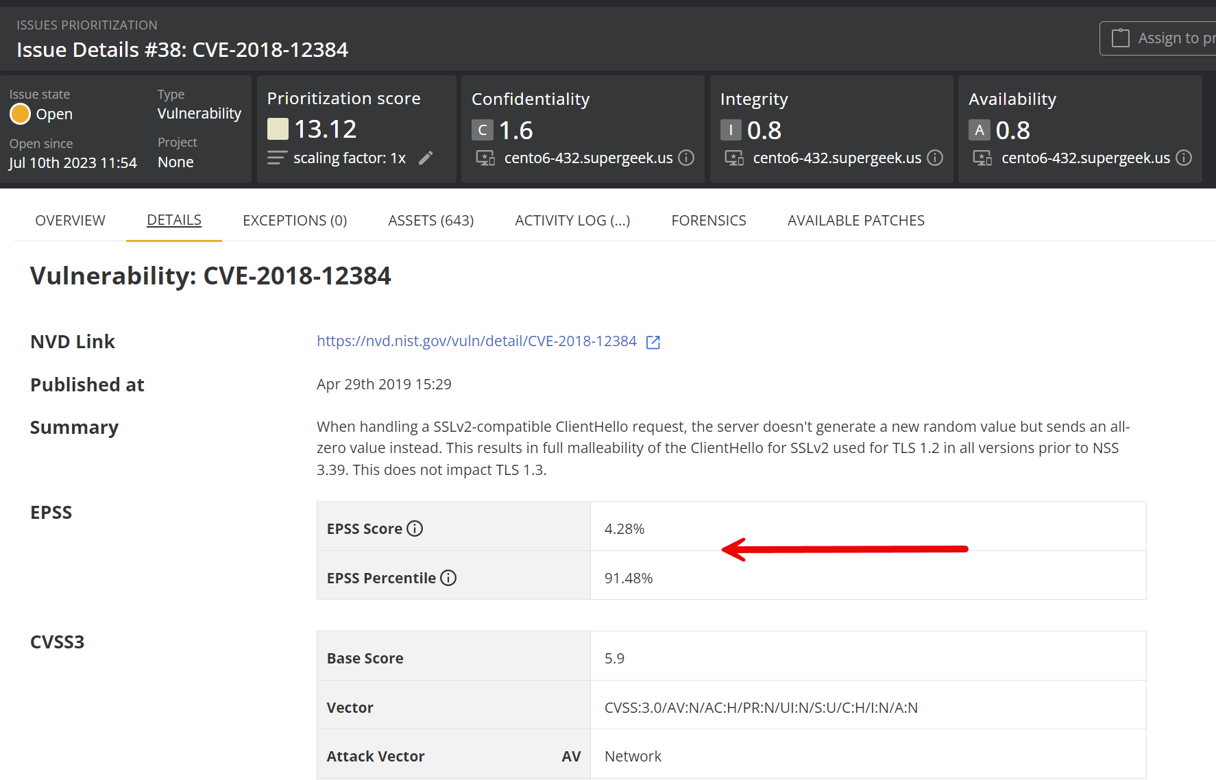 The EPSS score of a vulnerability is visible from the issue details view.