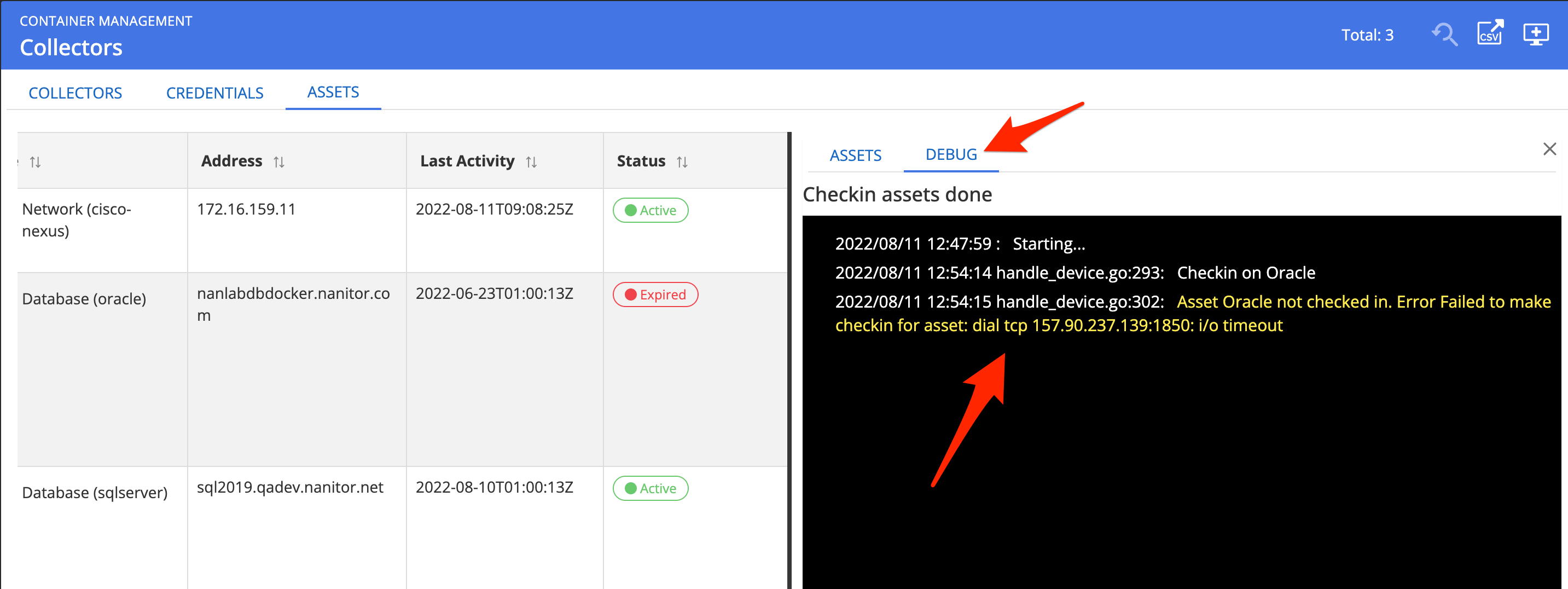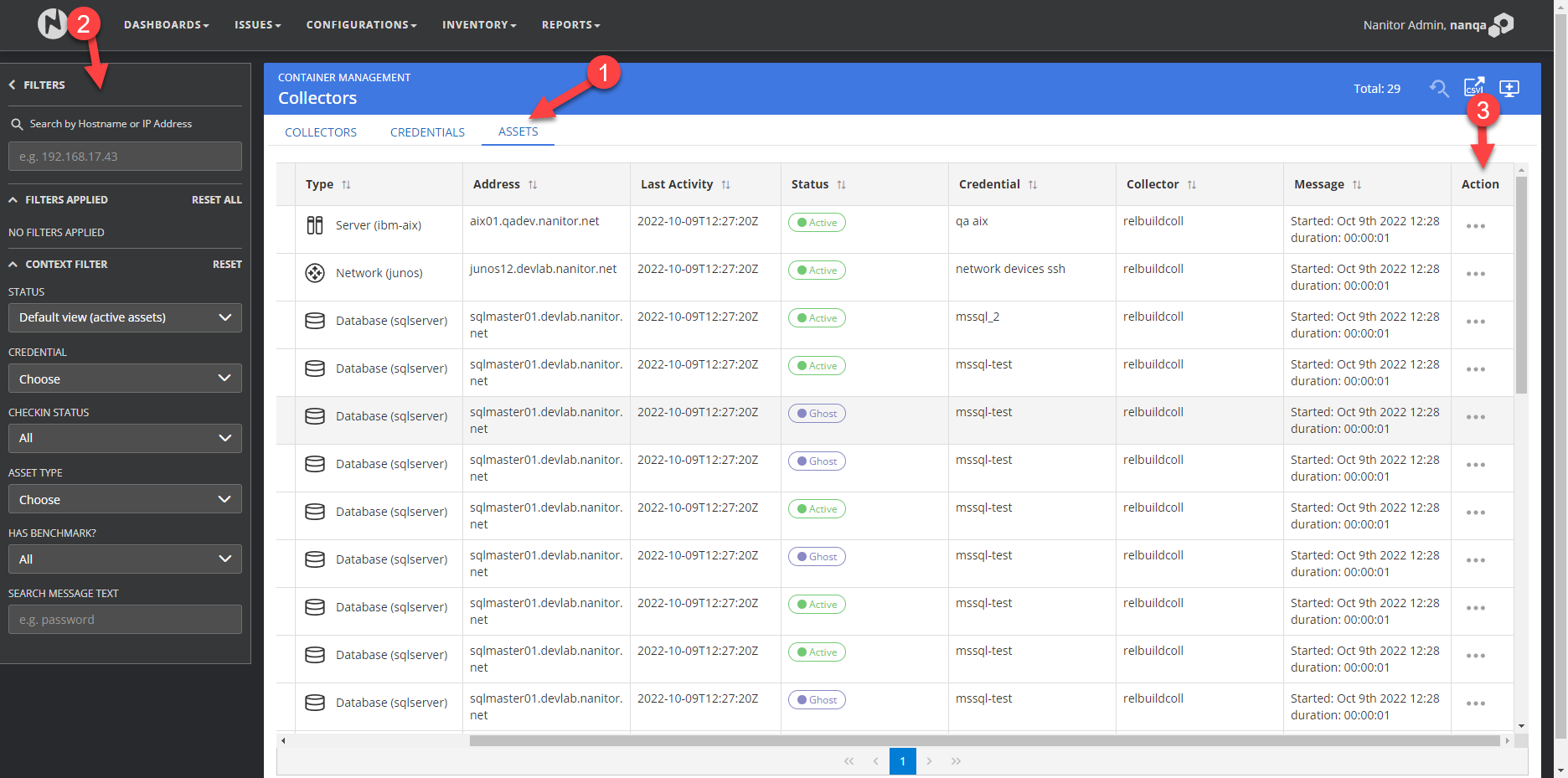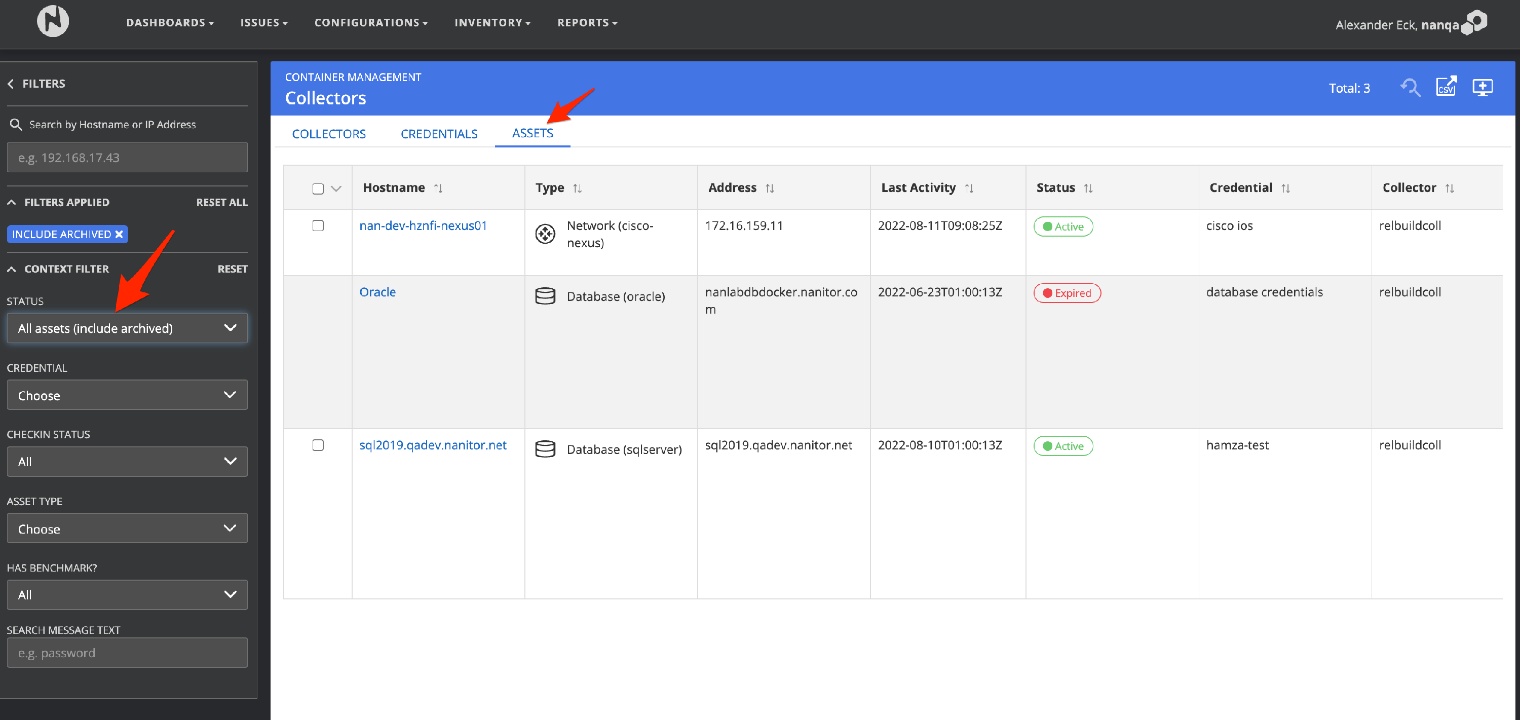 When a collected device is not checking in anymore, does not get a benchmark assigned, or has even expired you can use Nanitor to troubleshoot the root cause from inside Nanitor. From the Nanitor collector interface select the Asset tab. You can use the asset filter on the left to show e.g. archived assets.