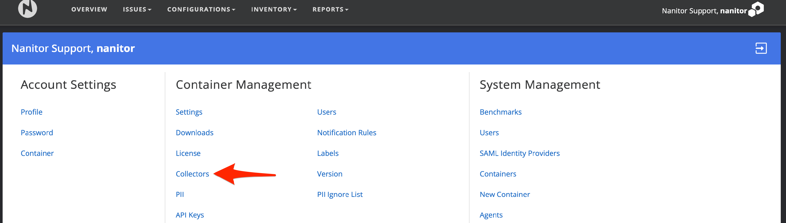 From the Nanitor administration menu under the organization, management selects Collectors to enter the area where you can add devices to your Nanitor instance