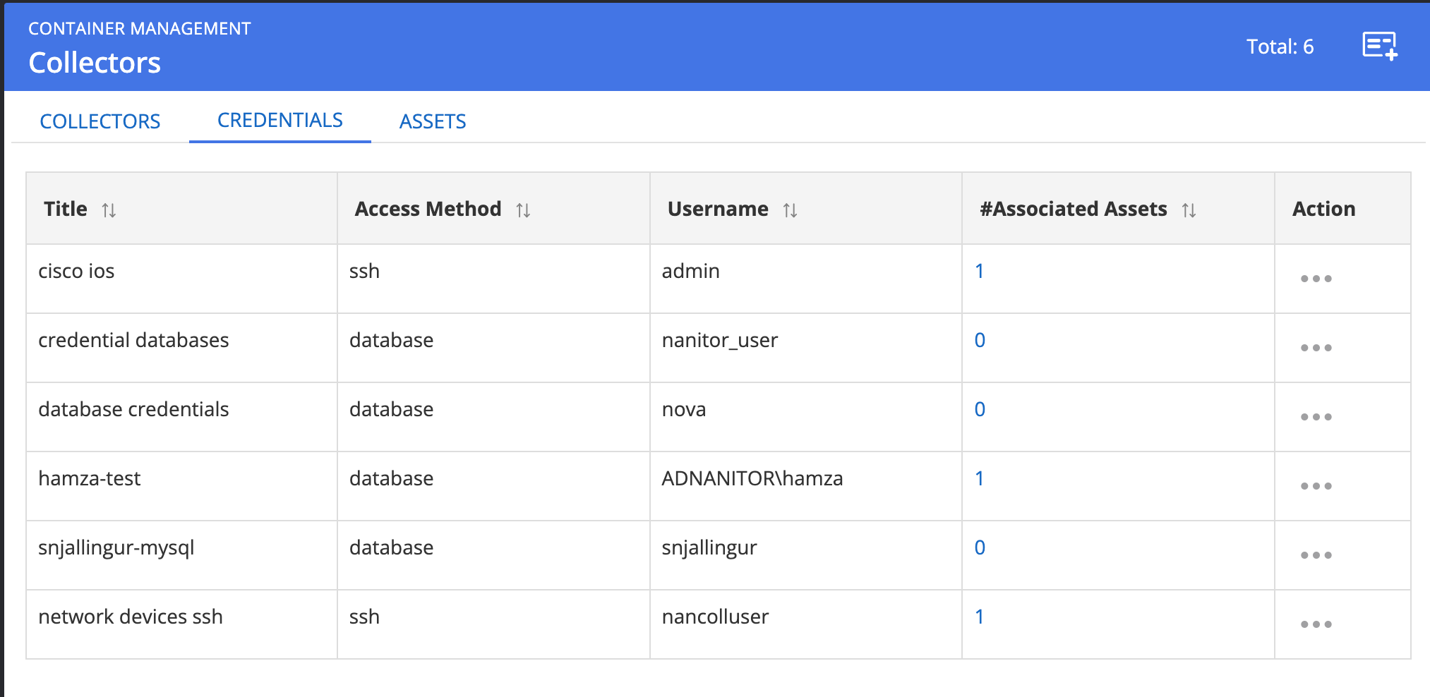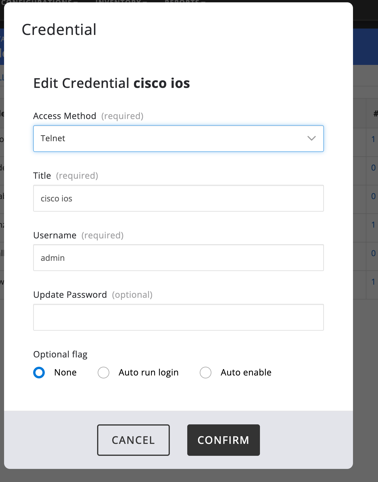 The Nanitor collector uses a user credential to log into a device (network device, database, AIX Server, etc.) to collect information from. This user is identified with a username and a password and is referred to as credentials in Nanitor. The collector operates by connecting to a specified device, log-in with specified credentials, and collecting information about the device. It is important that the credentials provided have admin privileges as much of the information that needs to be collected is only viewable by admin-type accounts. The collector will only issue commands that show information, at no point does the collector issue any commands that make any changes to anything. For Cisco-type devices, for example, this means the collector needs to be able to enter enable mode and issue privilege show commands, some of which require level 15 privilege. At no point does the collector enter configuration mode nor use any command other than show commands. Here is what the credential screen looks like