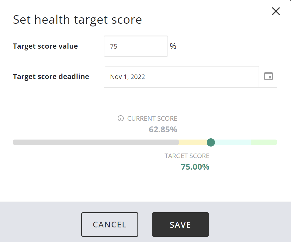 In version 2.6 we introduced a way for the user to specify what they would like for their health score target. For deep dive into our health scores, check out our article on Health Status Dashboard