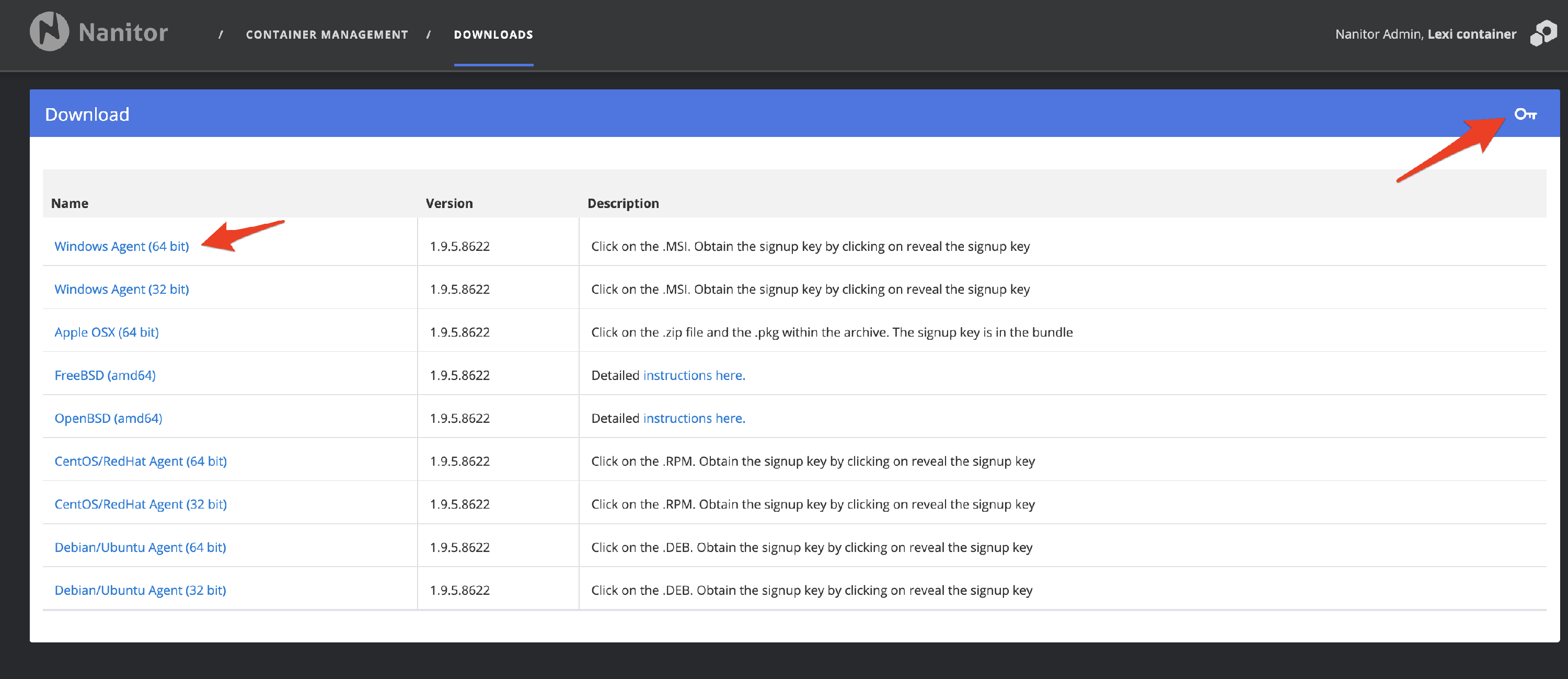 The agent(s) are downloaded by clicking on the link in the Name column. The required Signup URL is usually included in the zipped download file or in the installer itself but can also be viewed/downloaded from the top right button.