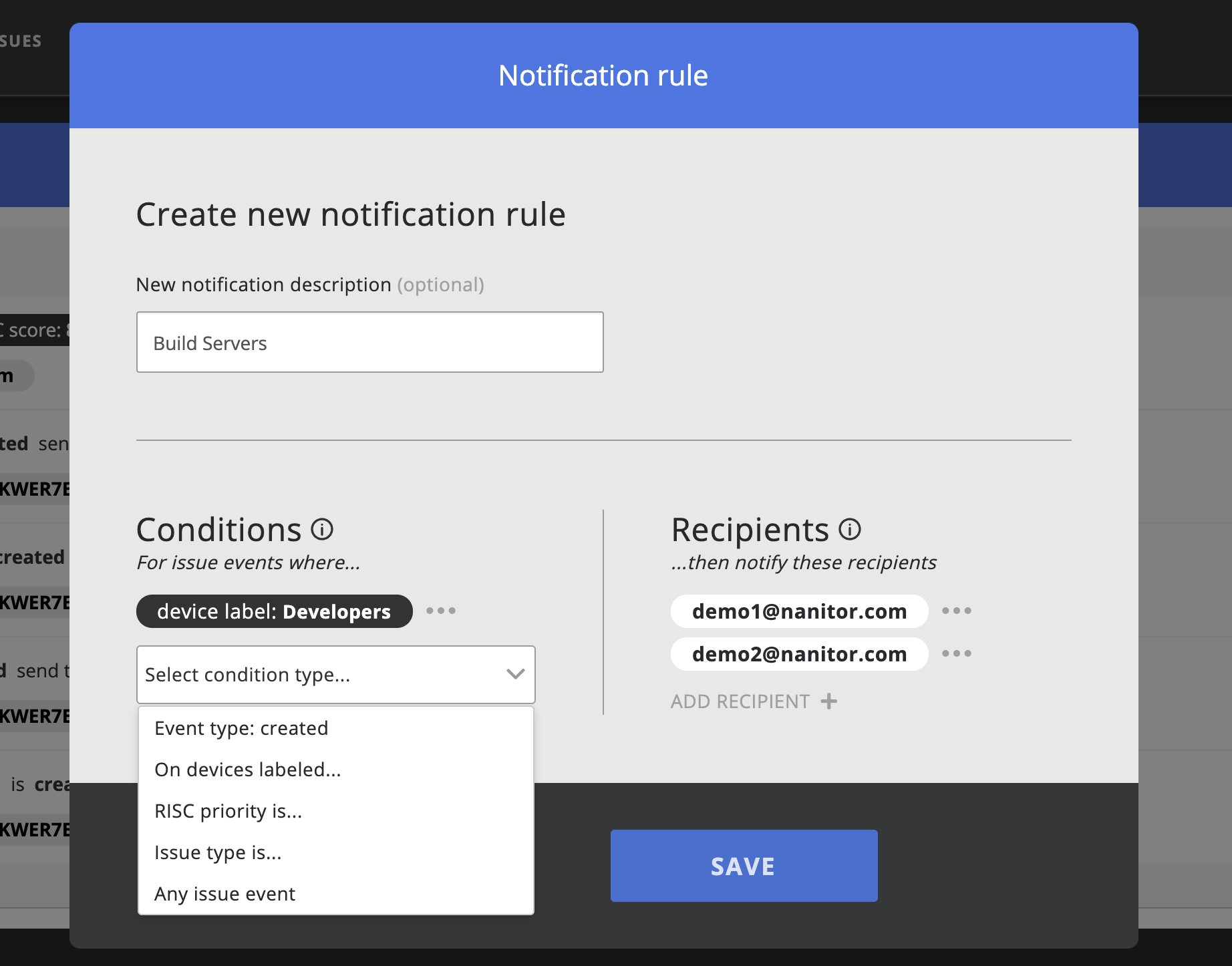 This will bring up the notification rule dialog where you can define and apply one or more rules and one or multiple email recipients.