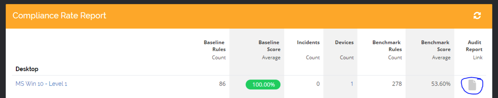 On the compliance report page one can view the benchmark rules and create a baseline, but can also view the audit report which is a printer-friendly view to show the compliance status on benchmark-level and show an auditor or create a work list. Here is how you access the audit report: