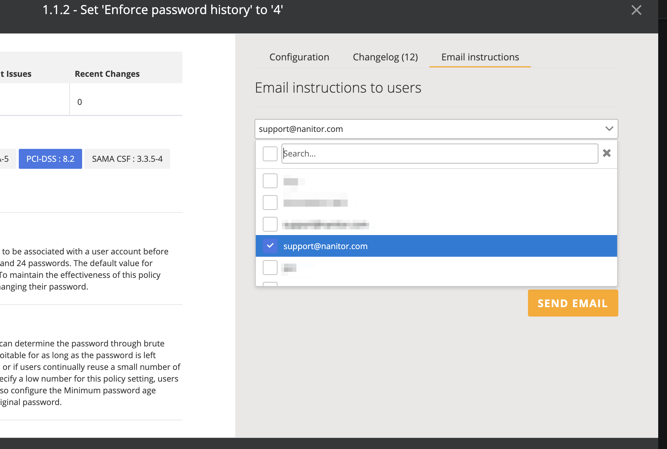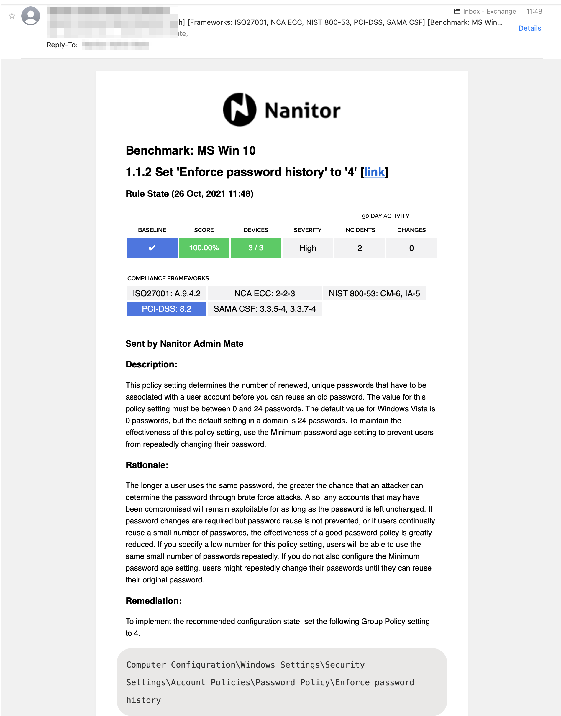 Nanitor supports sending email instructions for benchmark rules including remediation instructions and the status to one or multiple Nanitor user(s).