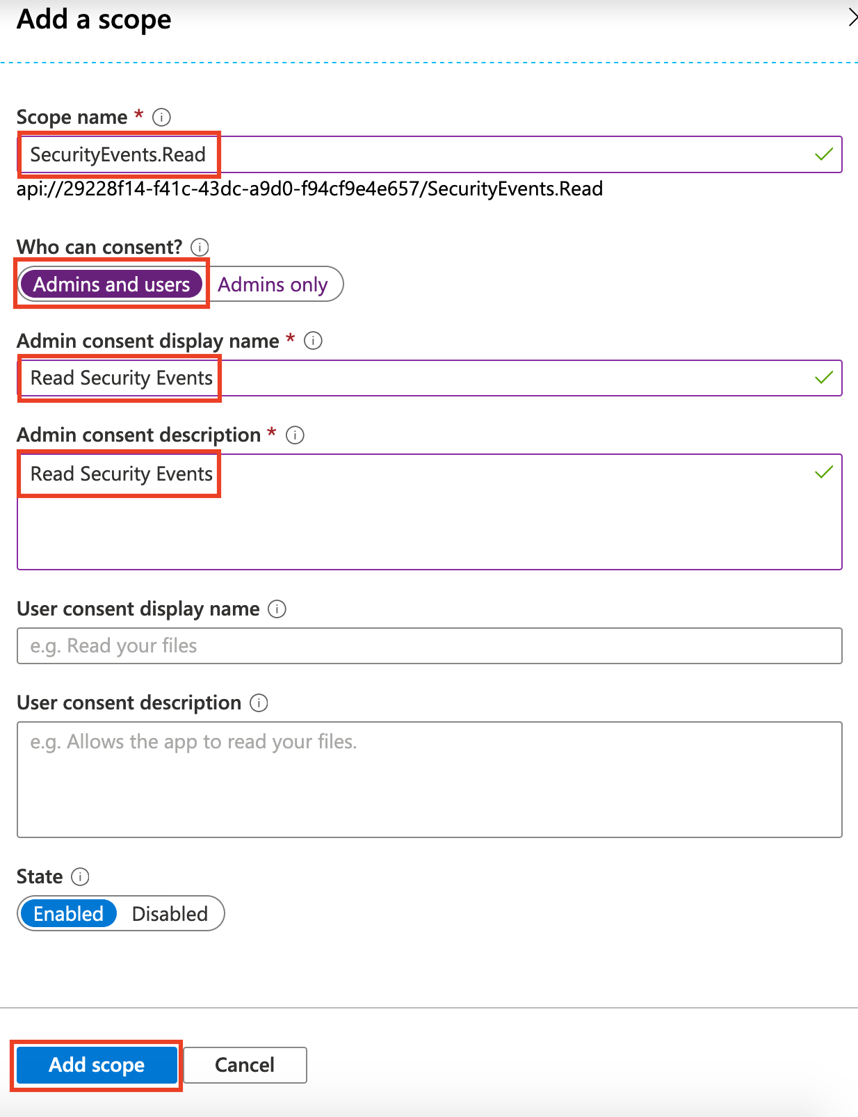 3. Add a scope named SecurityEvents.Read with both Admins and users able to consent. Set the consent display name and description.