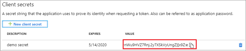 Lastly, it requires a Client Secret, which can be created on the “Certificates & Secrets” page of the application:. The secret is created by pressing Client Secrets -> “New client secret”, and provide a description, as well as duration, for the secret, and selecting “Add”.