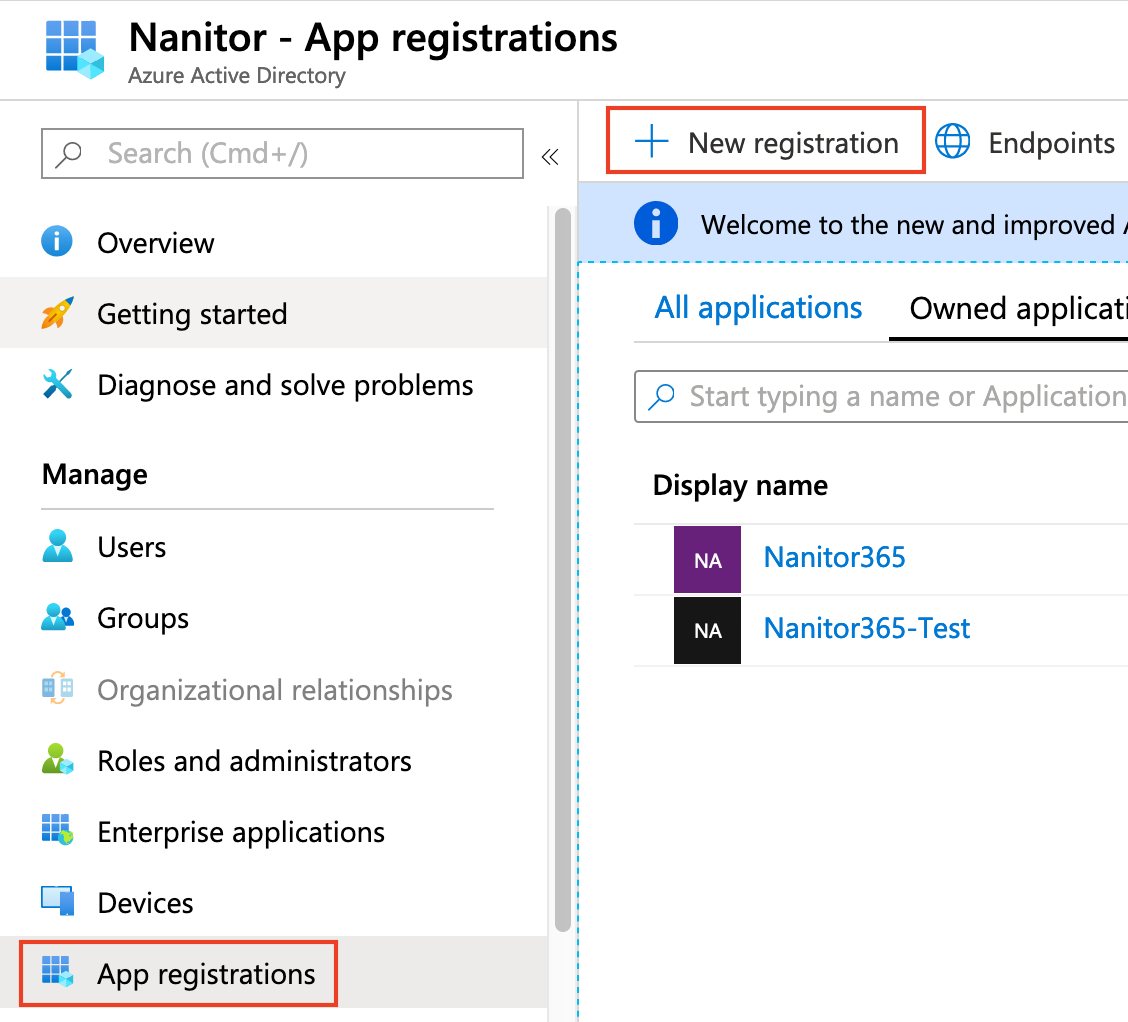 - Select Azure Active Directory -> App registrations -> New registration