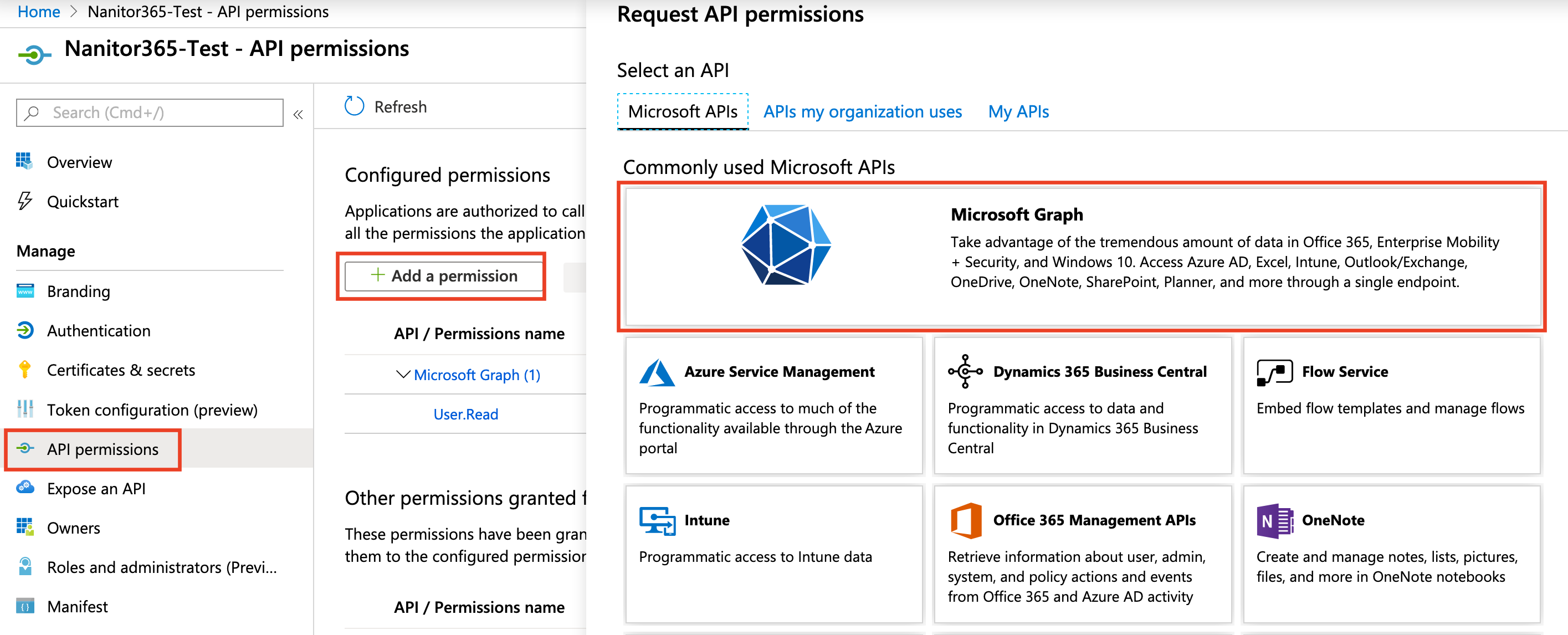 - Once the application has been registered, adjust the API permissions. Head to API Premissions -> Add a premission -> Microsoft Graph.