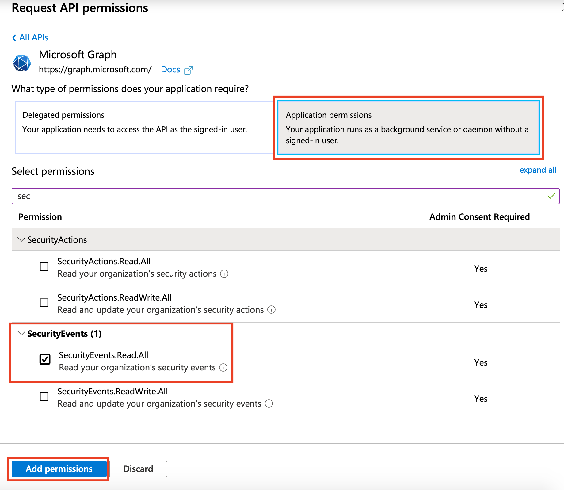 2. Select SecurityEvents -> SecurityEvents.Read.All