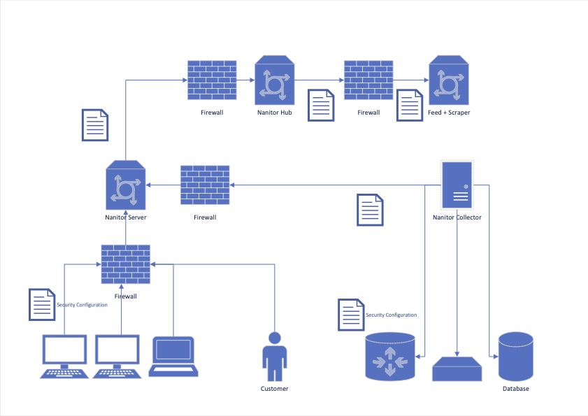 The Nanitor architecture is an infrastructure of several components shown in the below image. For an IT security monitoring solution, it is essential to understand how the different components work together and to know what information is pulled/pushed between them.