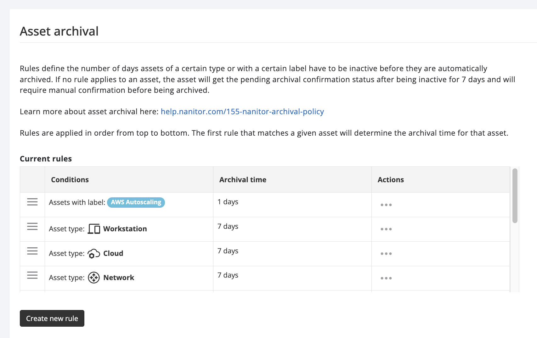 To address the challenges associated with managing short-lived assets (such as in cloud autoscaling groups, etc.), we've introduced the capability to define archival rules based on asset labels. This feature provides the flexibility needed to manage the lifecycle of dynamically changing assets efficiently.