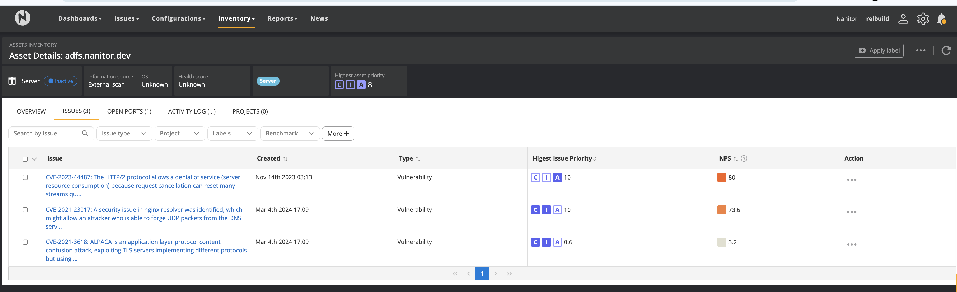 - 2024-03-20: A new server-only build (nanitor-4.9.0.12218-14578-master) was published to limit the frequency of sending vulnerability oval device requests to the same device (once per 20 hours) to address a problem that was affecting a limited scope of servers.