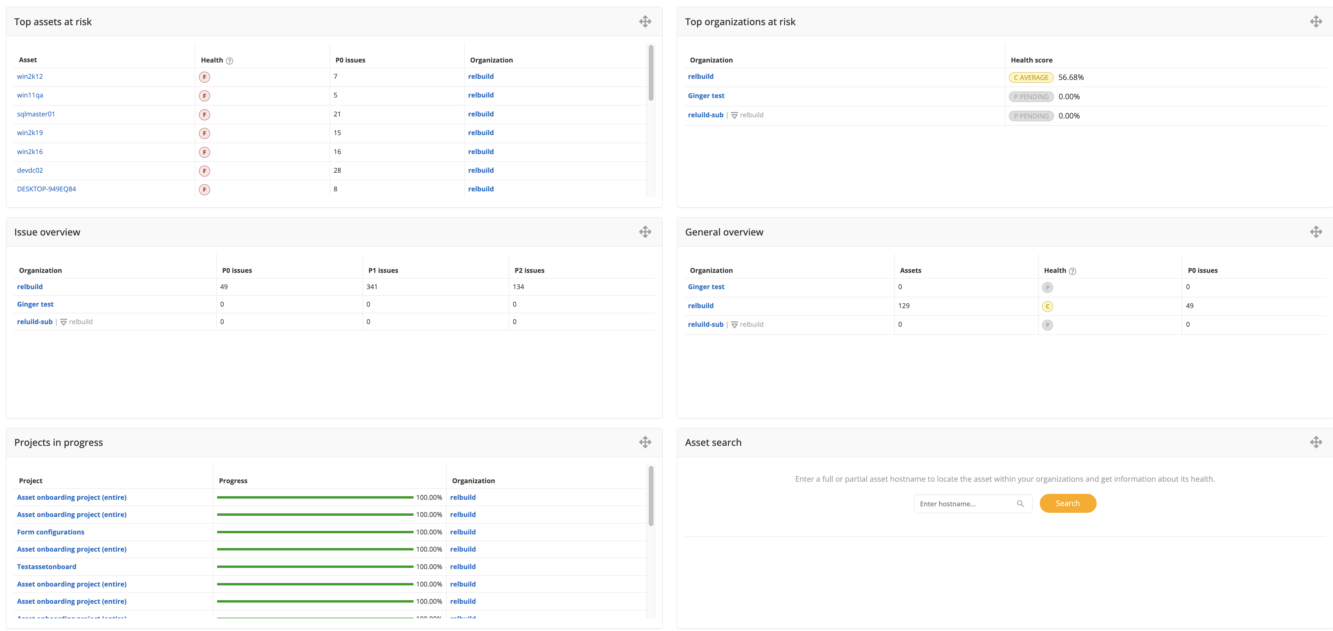 General overview: shows the list of organizations, asset distribution, health score, and P0 issue count.