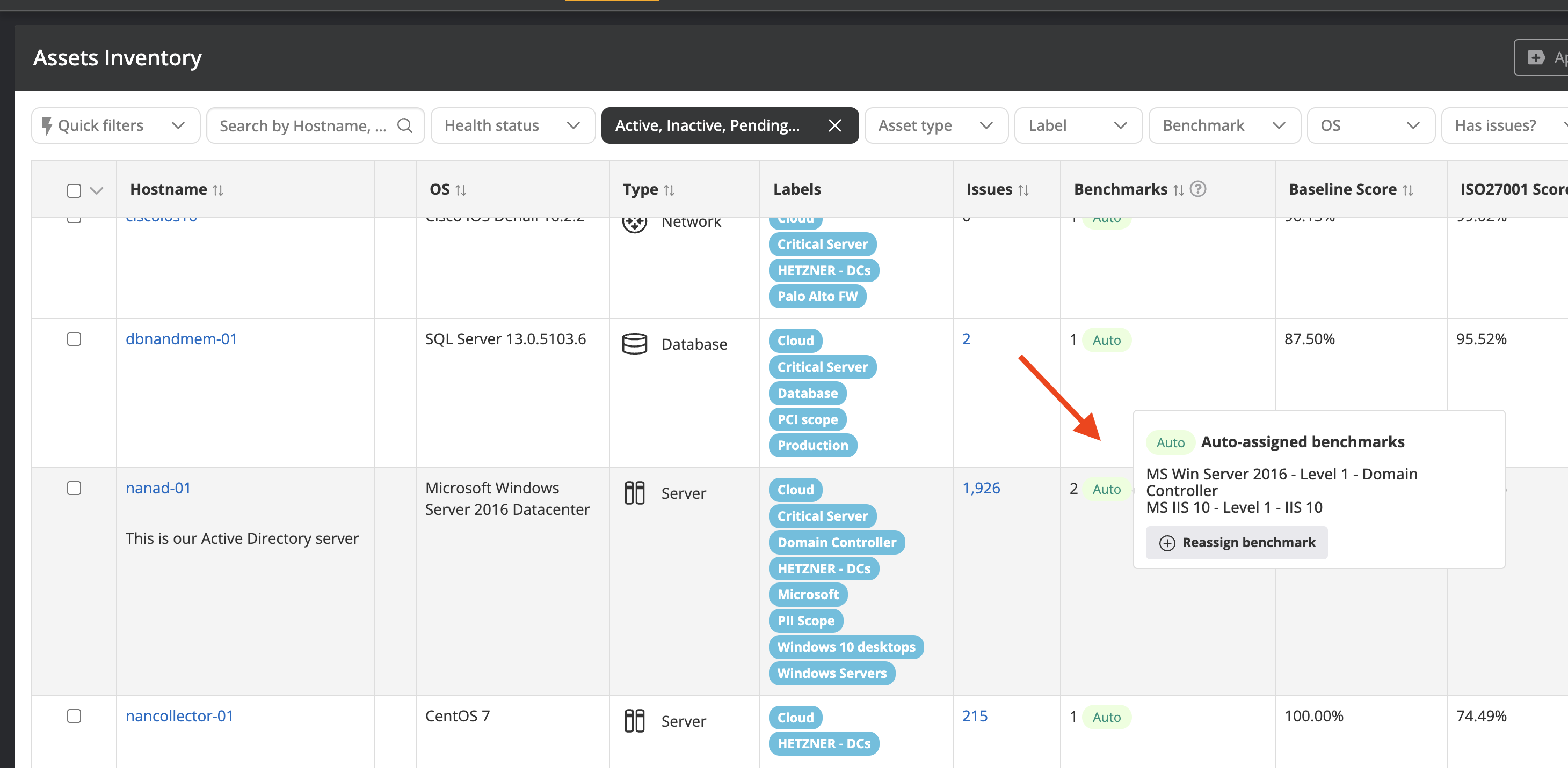 The asset inventory Benchmarks column shows the benchmarks that are currently applied.