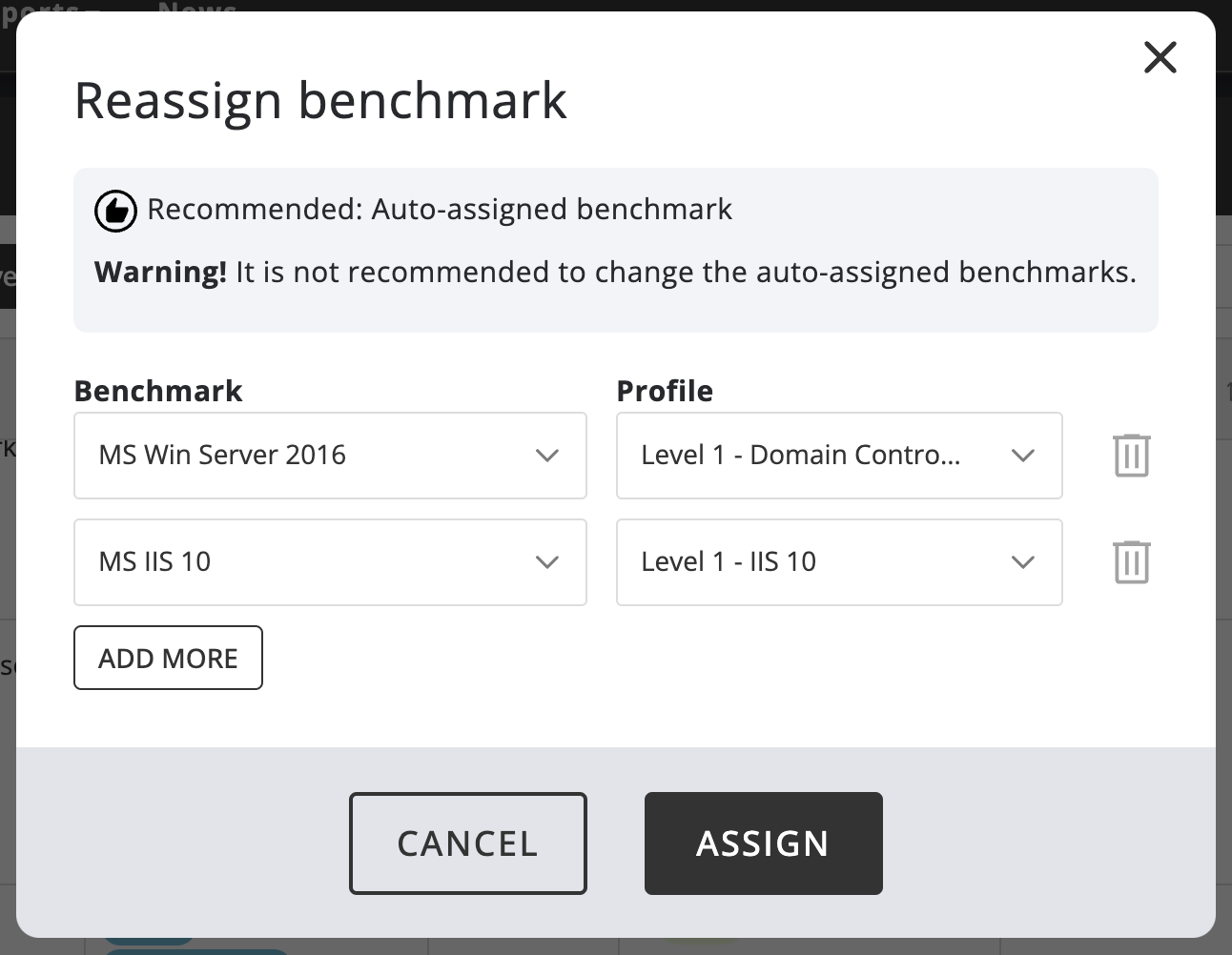 The user can choose to reassign a benchmark. This can be useful in cases where the user prefers a different benchmark than the one that has been auto-assigned, such as Intune managed vs. Domain managed Windows benchmarks.