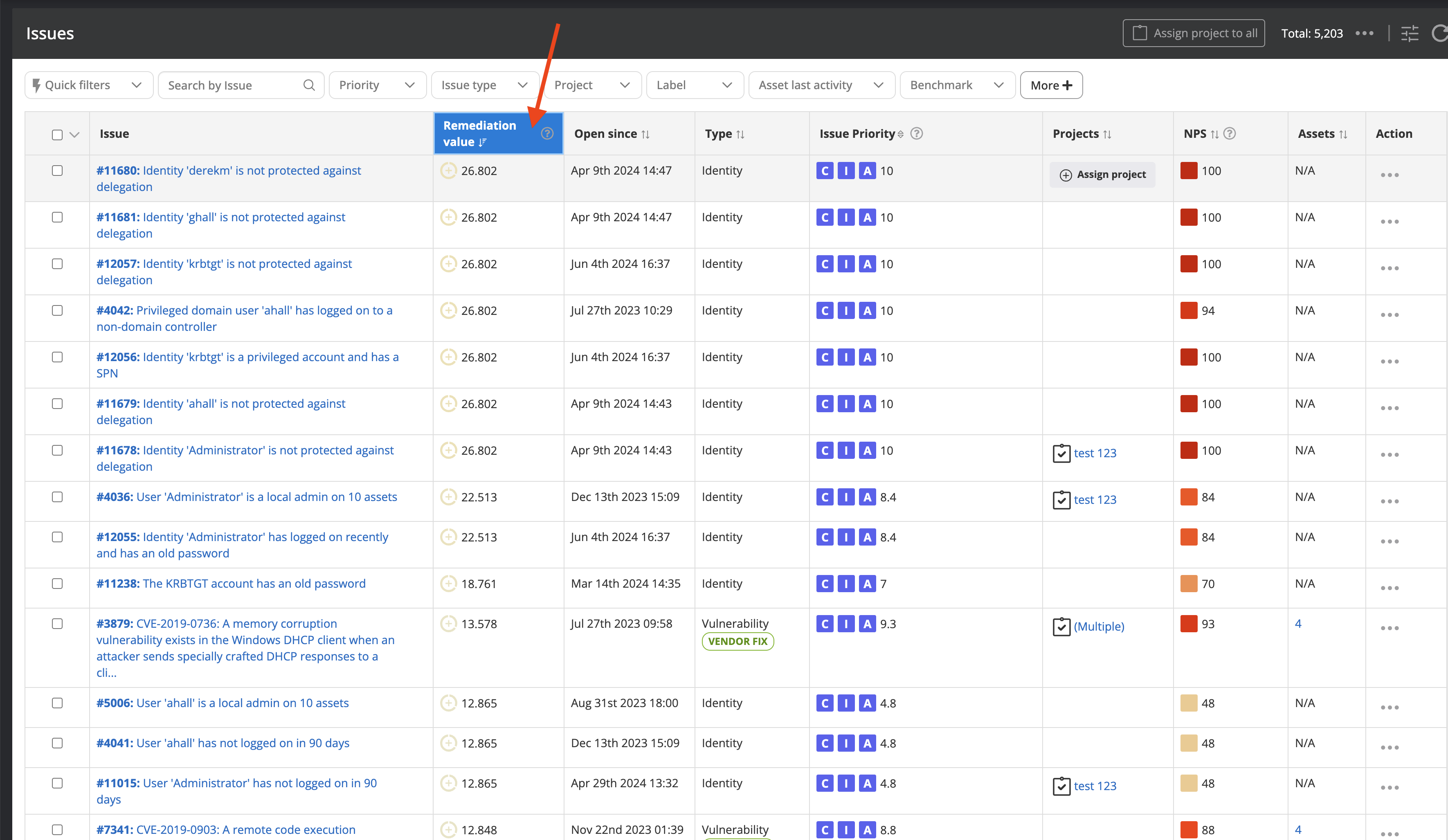The main difference between Remediation Value and NPS (Nanitor Prioritization Score) is that the former accounts for the number of assets affected as a proportion of the total number of assets for the organization, while the latter is based on the most critical individual asset affected by the issue. Essentially, NPS identifies where the organization's most pressing individual weak points are, while the Remediation Value provides a measure of which issues have the greatest total impact on the organization's security health. In comparison to the Health Score Impact, the RV is linear and easier to work with. The Health Score Impact is often close to 0 if there are many issues of a given type or a large number of assets.
