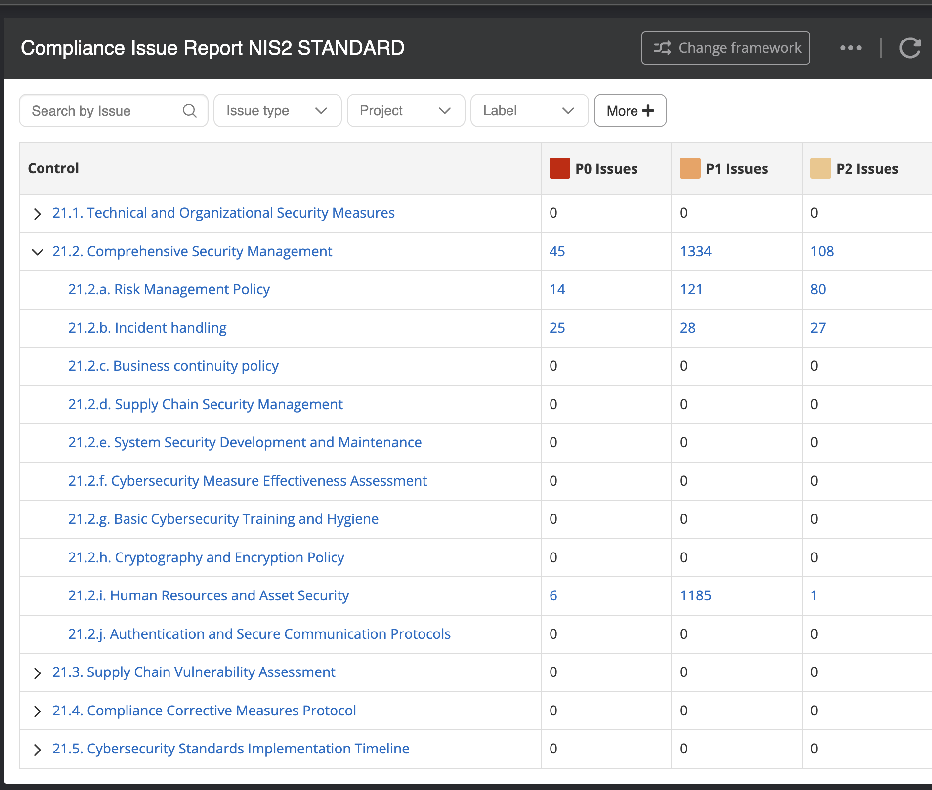 The Compliance Issues report with the NIS2 framework selected provides an overview of your standing with respect to the NIS2 requirements. This gives users a comprehensive view from a compliance perspective, highlighting where critical and less critical issues fall.