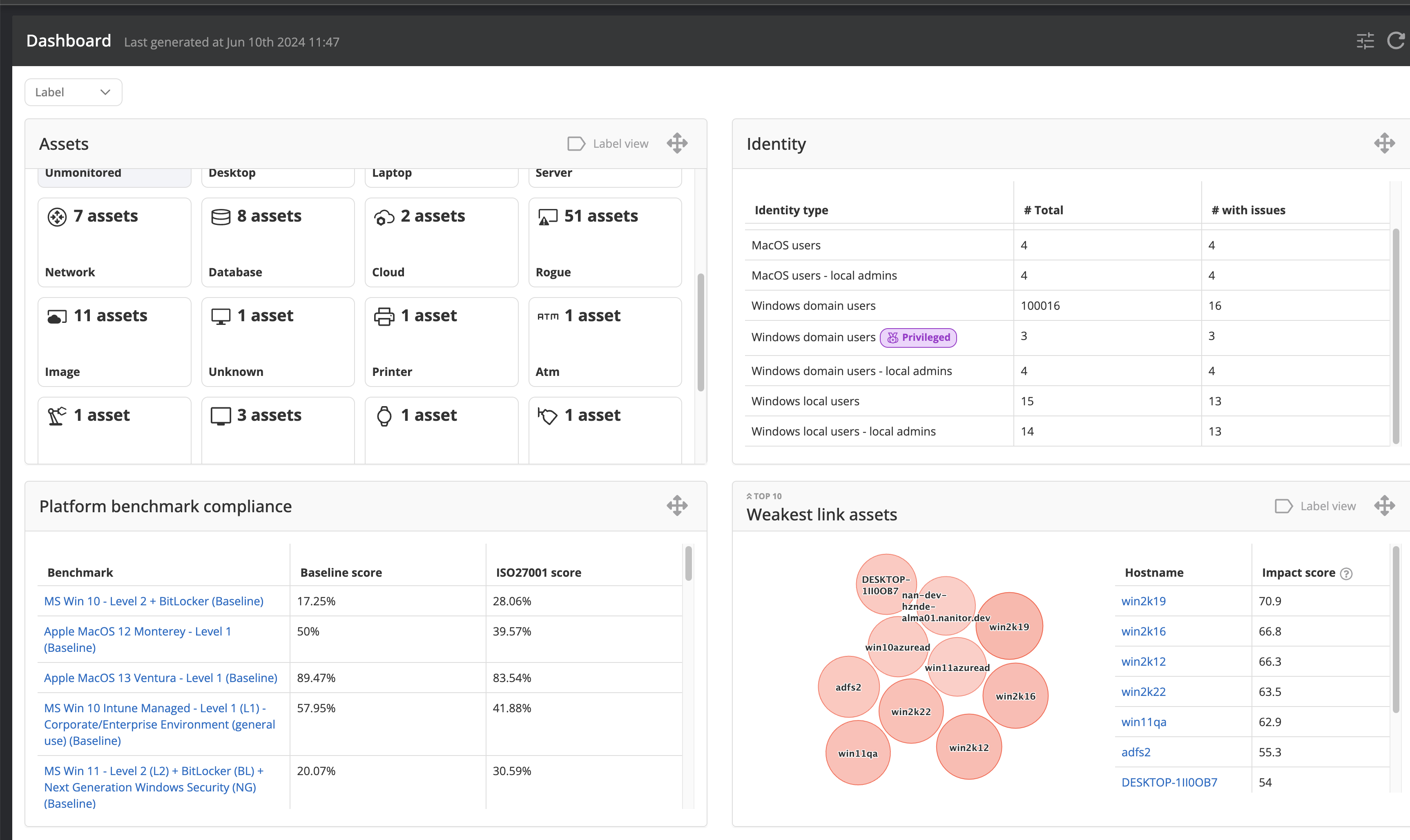 Overview Dashboard: UI Enhancements for Various Widgets: Updated several UI widgets, including the Assets widget, Configuration compliance score widget, Identity widget, Top unpatched assets widget, Internal vulnerabilities widget, Health score per label widget, and Issue type overview widget.