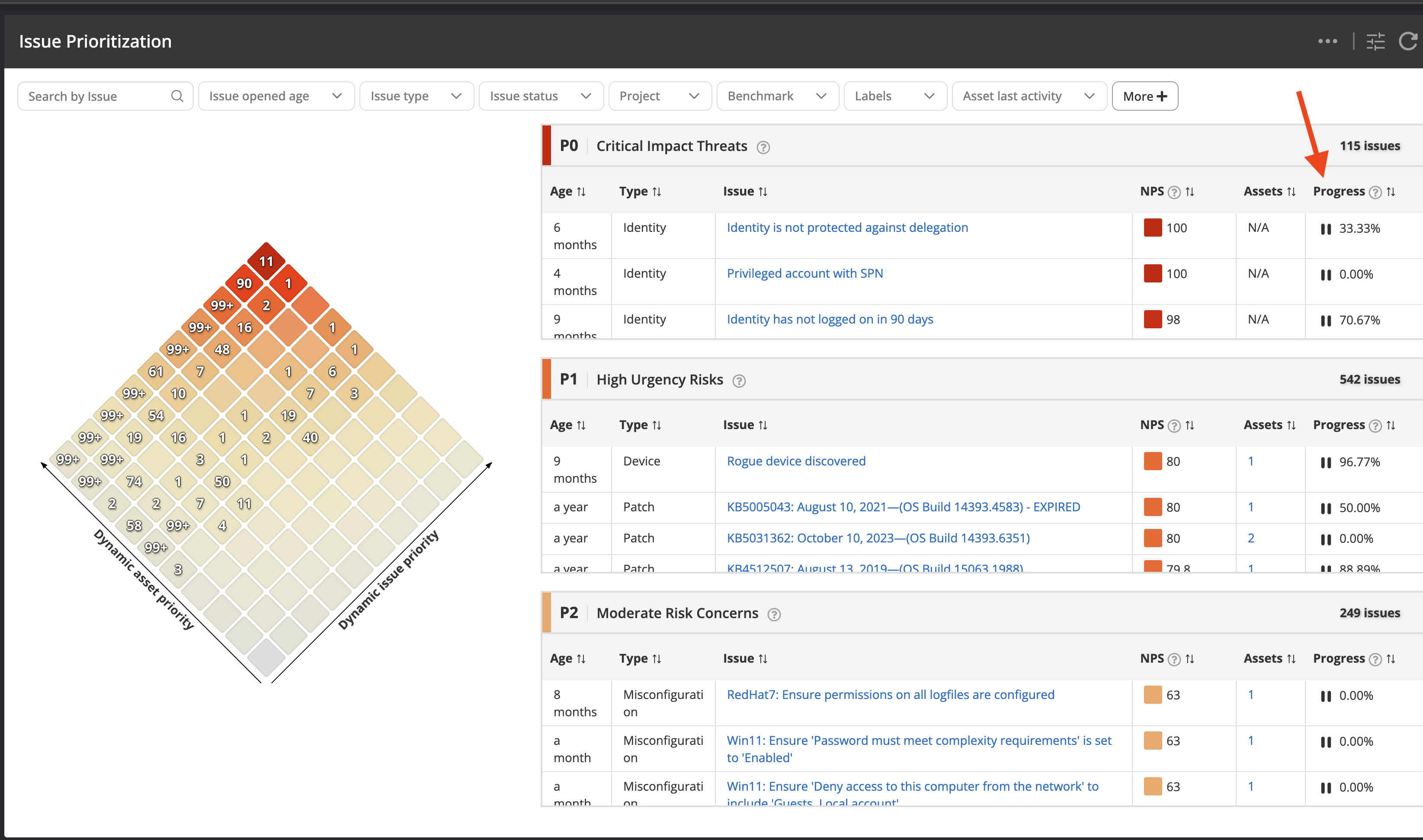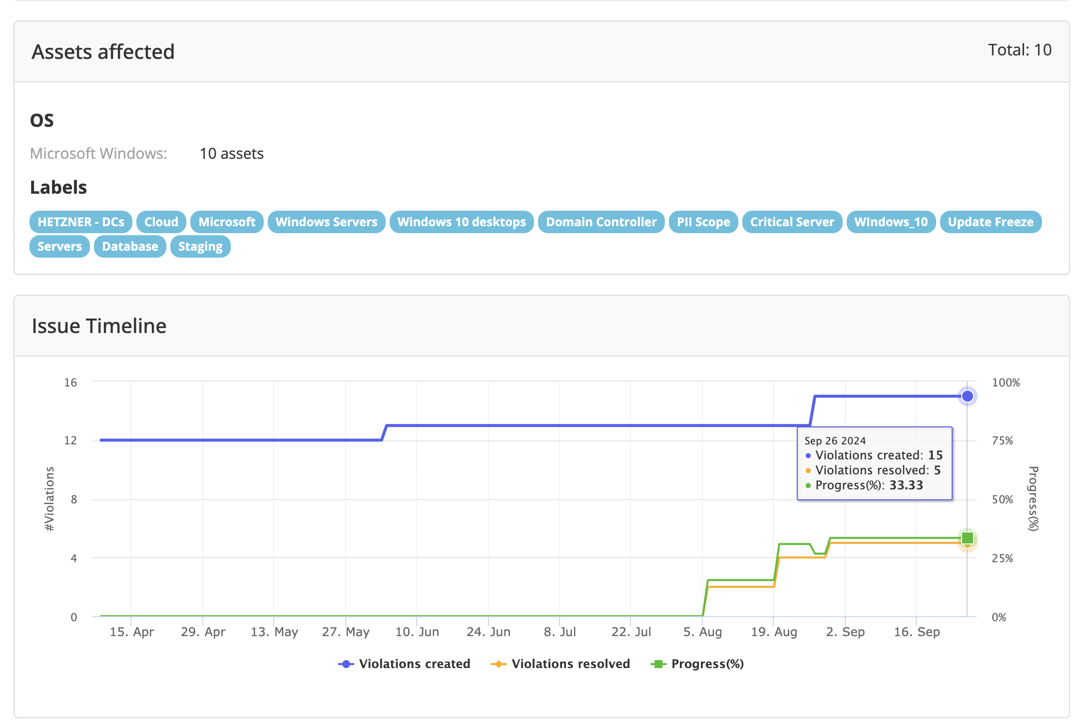 - Visualize and Track Issue Resolution: A new "Issue Progress" field tracks the percentage of resolved violations across assets. Additionally, an issue timeline provides a visual representation of how issues progress over time, helping identify where they are stalled and how quickly remediation efforts take effect.