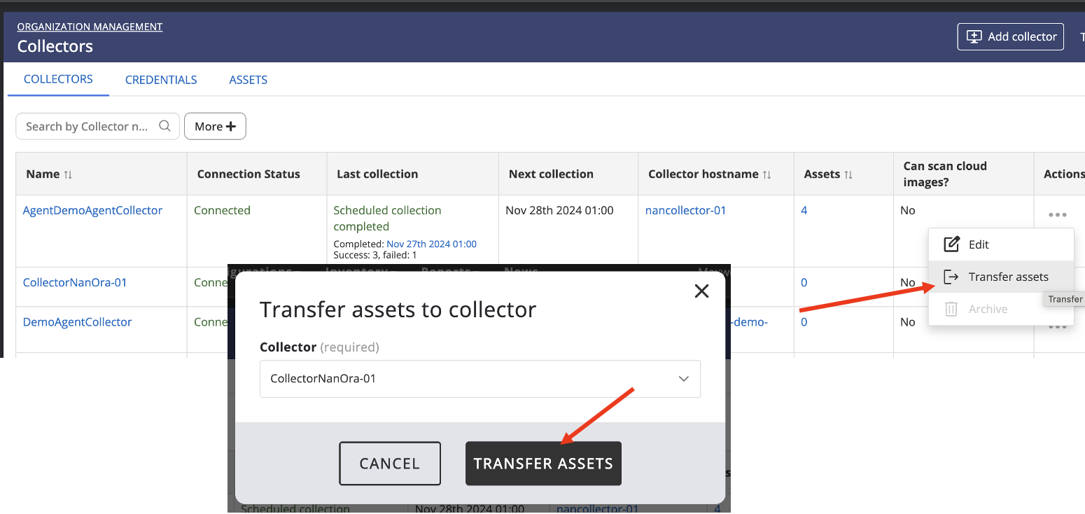 Users can now transfer all assets from a collector to a different collector. While it was possible before to select multiple assets and update their assigned collector using the "Set collector" option, this would only go through if the new collector was able to connect to the asset. With the new transfer option, all assets will be transferred immediately, and any assets the new collector cannot connect to can be addressed later when the collector fails to check them in. This makes it a better option when, for example, wishing to archive the old collector.