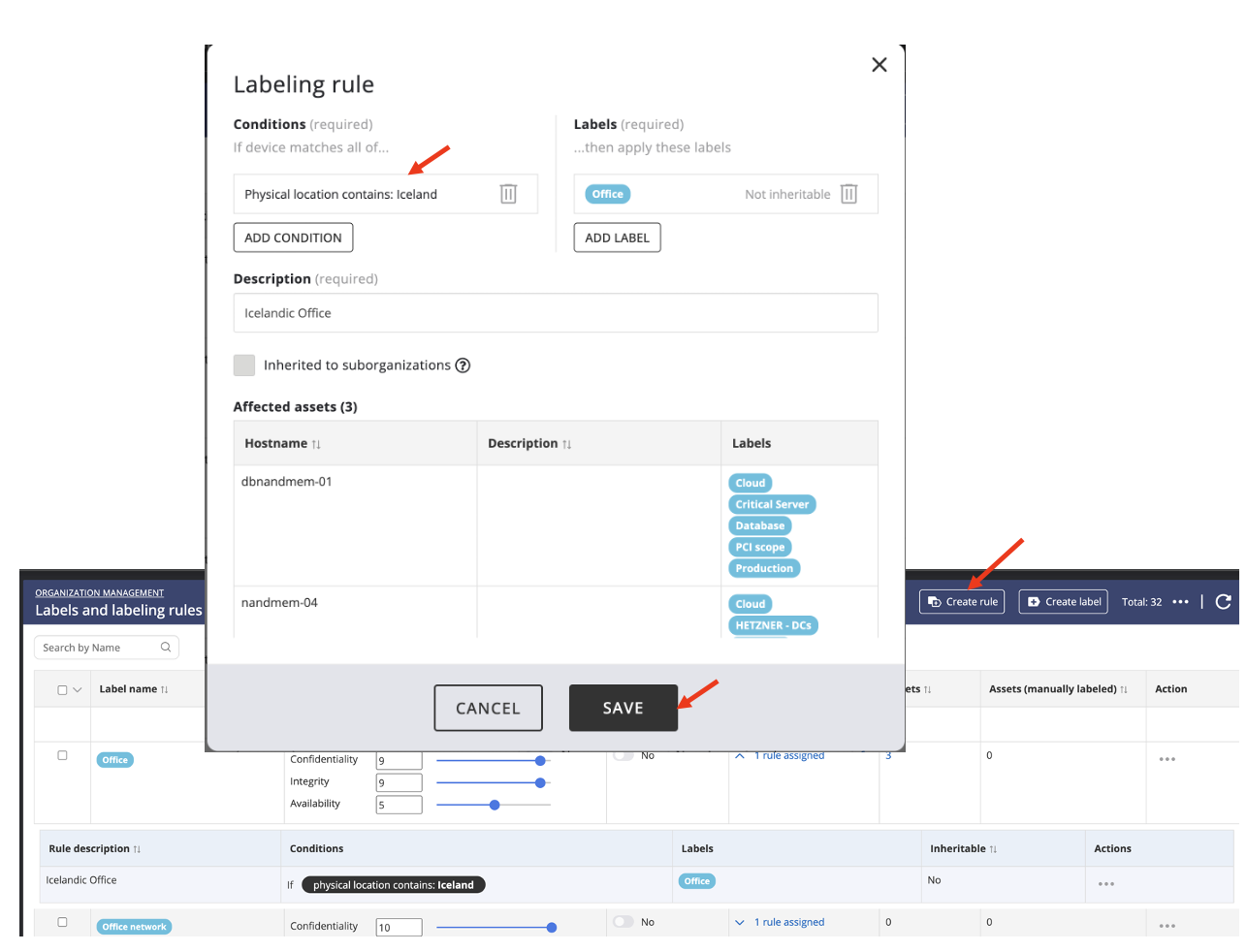Example: Here we have created an automated labeling rule to label all devices with the Physical Location field including the text Iceland: