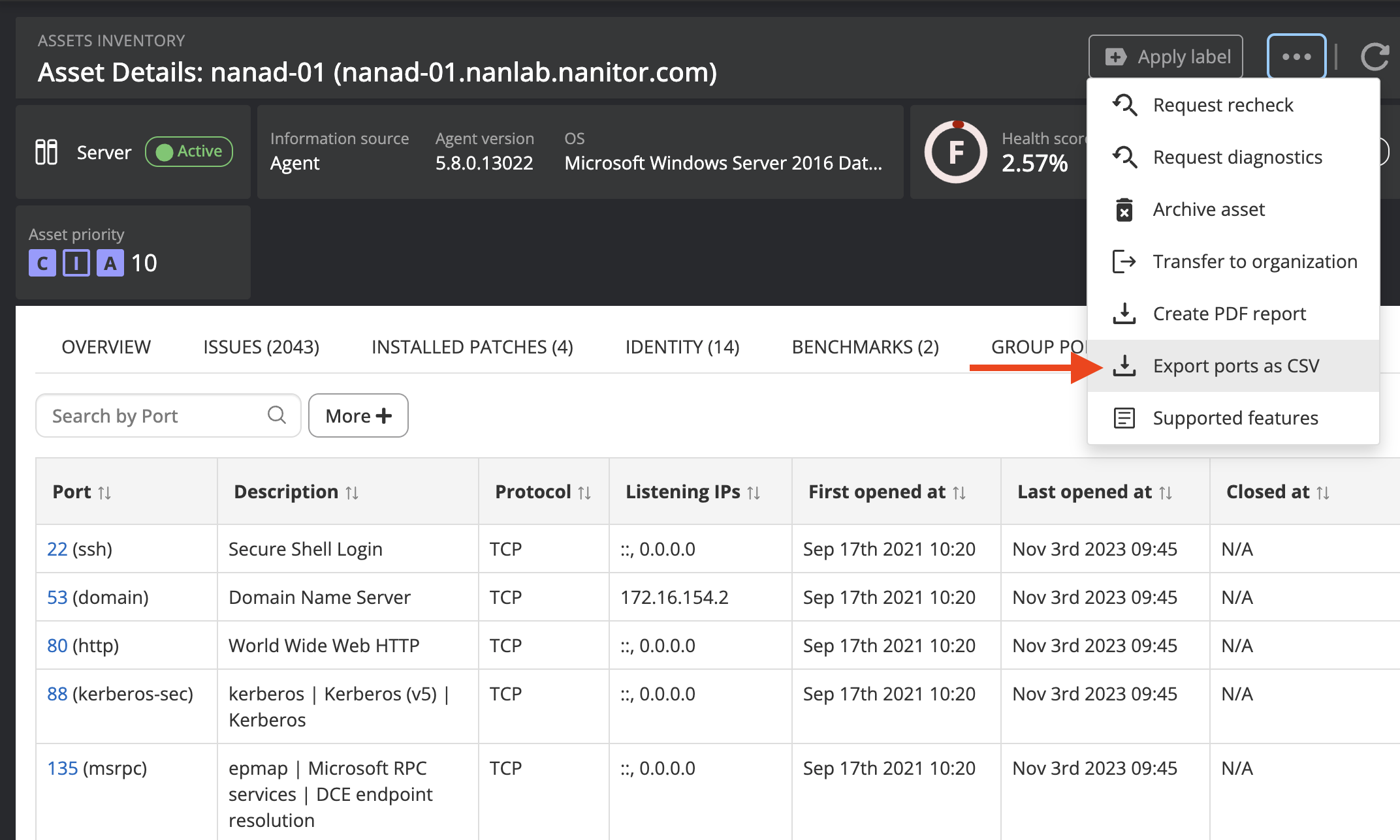 Users can now export a list of open ports directly from the asset details page. Previously, exporting open ports was limited to inventory-wide views, which required additional filtering and manual work for device-specific reports.