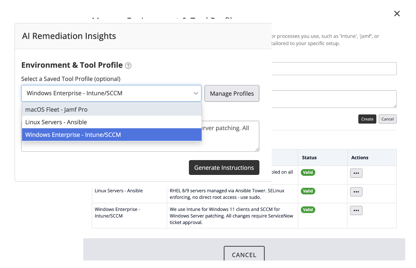 - Context Profiles: You can now save reusable profiles describing your environment, tools, and constraints (e.g., "RHEL 8/9 servers managed via Ansible Tower. SELinux enforcing, no direct root access - use sudo."). The AI will incorporate this context into its instructions, ensuring the remediation steps fit your actual workflows rather than providing generic advice.
